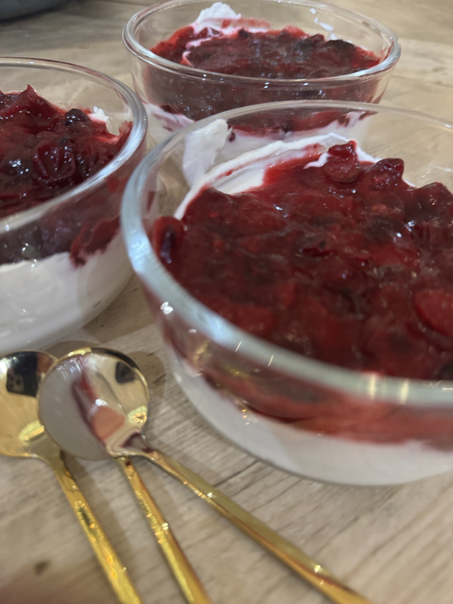 I spooned the cheesecake yogurt into four Pyrex containers, then layered in the cranberry compote. You can swirl it, layer it, or add a sprinkle of crushed graham-style cookies if you’re feeling extra festive. These keep beautifully in the fridge for a few days — ready whenever that sweet craving hits.